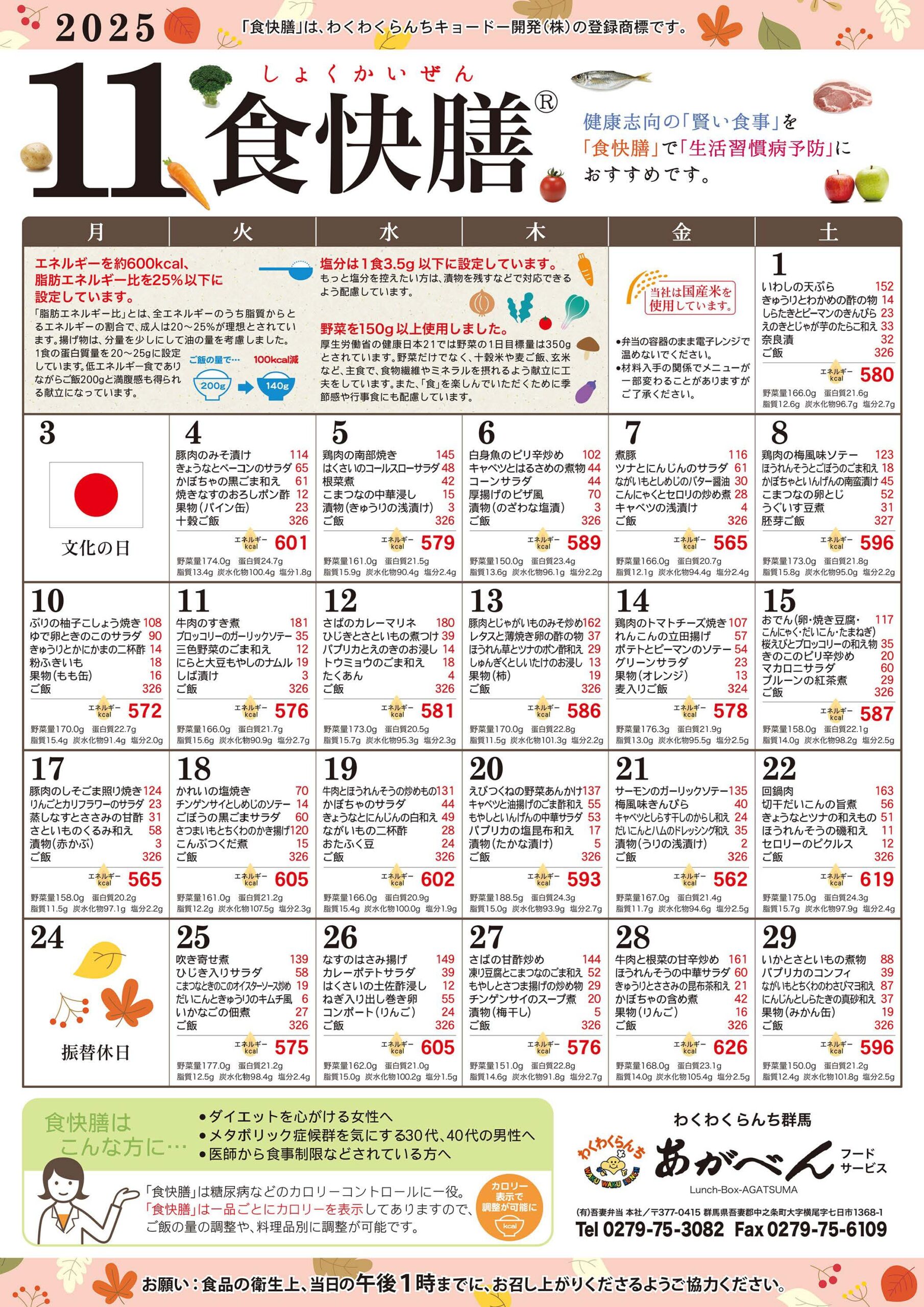 - エネルギー600kcal(±10%以内)たんぱく質20g程度で高齢の方、健康が気になる方、ダイエットしたい方、女性の方におすすめです。