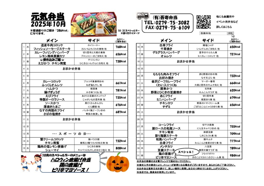 10月の元気弁当の献立カレンダーは以下のとおりです。