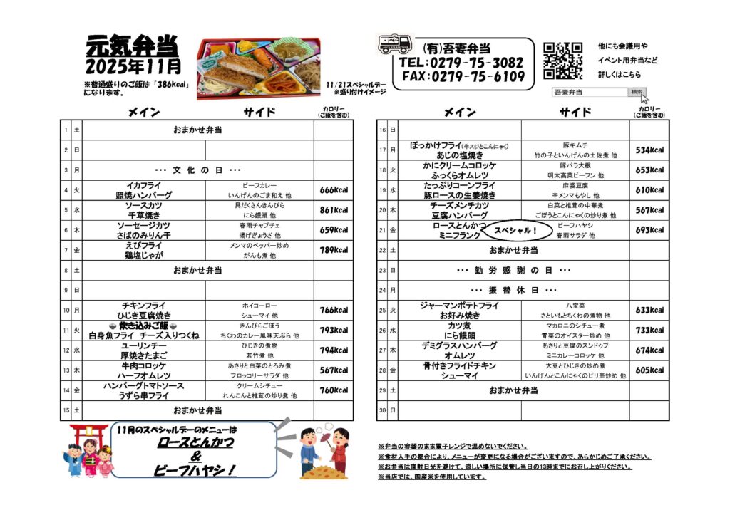 11月の元気弁当の献立カレンダーは以下のとおりです。